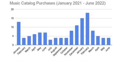 一、在過去的幾年資本力量對于音樂版權的交易是有著非常大的興趣,根據相關的數據報告顯示僅在2022年,公開版權的交易量就達到了18.9億美元,相比于往年增加了413%,持續到2021年這個數值仍舊是在增長,目前已經公開的交易金額是達到了52.8億,造成這種情況主要是由于音樂版權的出售,通常是曲庫一年的版稅收入乘上一個年度的倍數,和銀行利率和債券的價格是反向的關系。