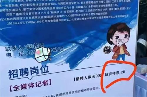 近日河南財(cái)經(jīng)政法大學(xué)舉辦的校園招聘會(huì)中河南廣播電視臺(tái)都市頻道全媒體記者的薪資待遇僅為2000元,而同會(huì)場(chǎng)的另一物業(yè)保安招聘公司就已經(jīng)達(dá)到了3600到4500,兩個(gè)職業(yè)之間的薪資差距被網(wǎng)友吐槽說記者的薪酬還不如保安,一時(shí)間關(guān)于基層記者的薪酬問題受到了全網(wǎng)的關(guān)注。