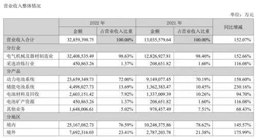 3月9日寧德時代披露2022全年的業(yè)績,在去年全年的營收首次超過3,000億元,達(dá)到3285.9億元,同比上漲152.7%。寧德時代在去年鋰離子電池銷量為289Gwh,同比增長116.6%。