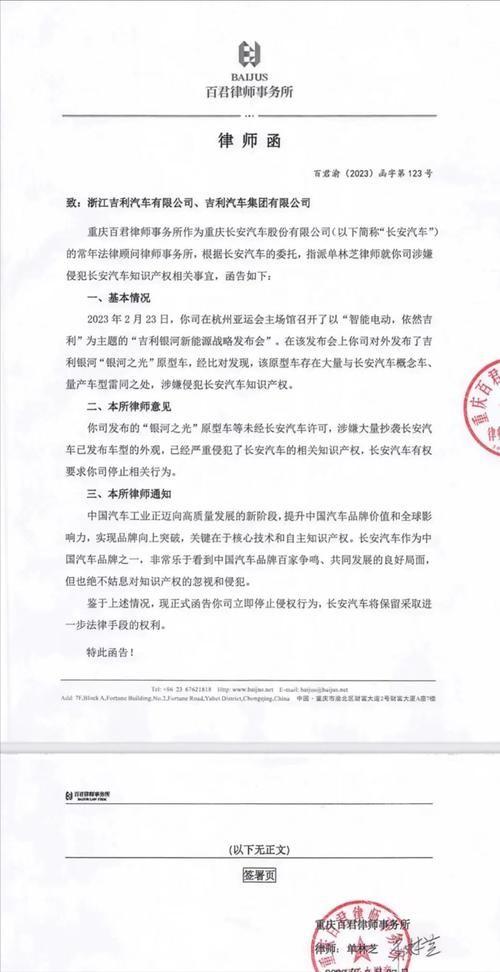 此次抄襲事件,長安汽車方面認為吉利銀河的銀河之光原型車與長安汽車的概念車和量產車型在很多地方都有雷同。目前長安汽車已經委托了重慶百君律師事務所向吉利汽車發送律師函。