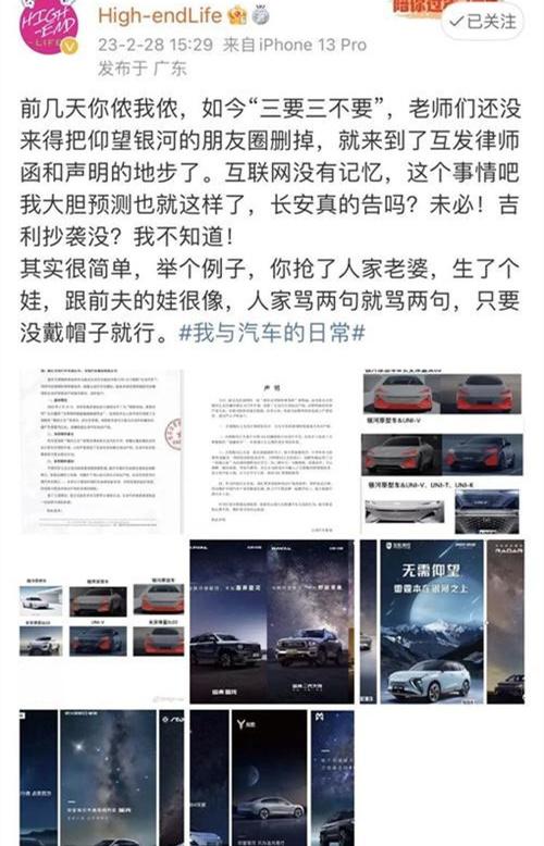 吉利汽車于2月23日推出了全新的新能源高端系列汽車吉利銀河。長安汽車于2月28日對吉利汽車發送律師函,稱吉利銀河的銀河之光原車型涉嫌抄襲長安汽車已發布的車型,侵犯了長安汽車的知識產權。