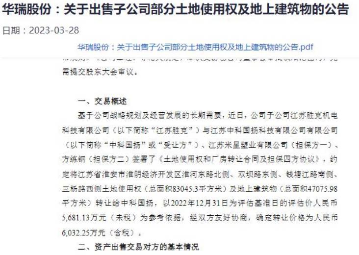 華瑞股份上市6年,很可能會面臨2022年凈利潤出現(xiàn)腰斬的窘境。根據(jù)3月27日晚間華融股份所披露的公告,可看出公司擬將子公司的一部分土地使用權和地上的建筑物出售,接盤方是江蘇中科國陽科技有限公司,是公司在1月29日才正式成立的。接盤方的資金來源和買地用途是存在質(zhì)疑的,華瑞股份還需要進一步就接盤方資質(zhì)問題向市場說明。