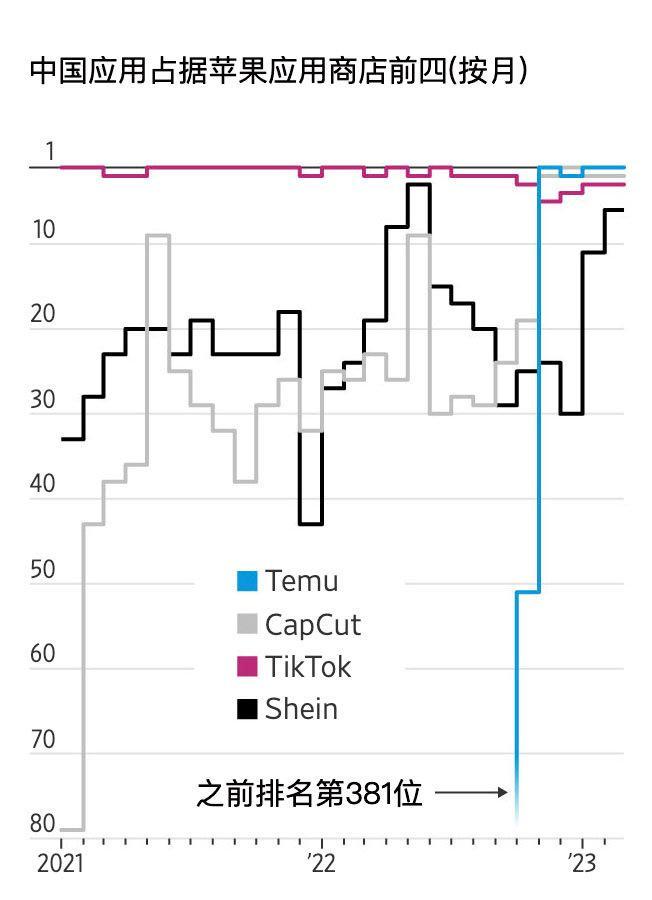 3月份的前三周拼多多海外版Temu,作為美國眾多應用商店當中下載量最大的一款APP,緊隨其后的則是去剪輯TikTok視頻的編輯類平臺,也就是剪映的海外版,以及TikTok本身,作為快手上的零售商Shein 排在第四,之后則是臉書唯一一名在前五排名,但并不是中國企業的APP。