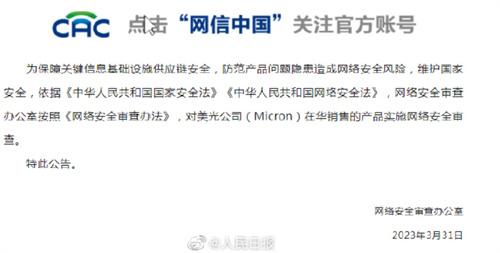 在3月31日,國家網(wǎng)絡(luò)安全審查辦公室發(fā)布了一條公告,公告中宣稱為了保障關(guān)鍵信息基礎(chǔ)設(shè)施供應(yīng)鏈安全,防范產(chǎn)品問題隱患所造成的各種網(wǎng)絡(luò)安全風(fēng)險,依據(jù)國家安全法和國家網(wǎng)絡(luò)安全法,依法對美光公司在華所銷售的各種產(chǎn)品實施網(wǎng)絡(luò)安全審查,這一則消息爆料之后,美光科技的股價一時之間連續(xù)崩盤,下跌了約3%左右。