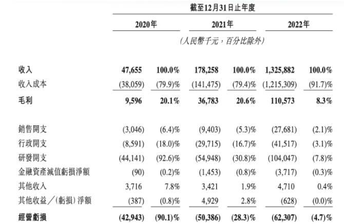 港交所網(wǎng)站最新顯示,知行汽車科技股份有限公司于4月4日正式在港交所遞交主板上市申請,花旗銀行,華泰國際與建銀國際為該申請聯(lián)席保薦人,據(jù)了解知行科技招股書顯示,2020年至2022年,知行科技公司營收分別是4766萬,1.78億和13.26億元,虧損分別是5282萬,4.64億和3.42億元,2022年的毛的率下降了約12.3%,據(jù)知情人透露,該公司的收入約有百分之96來自于吉利集團。