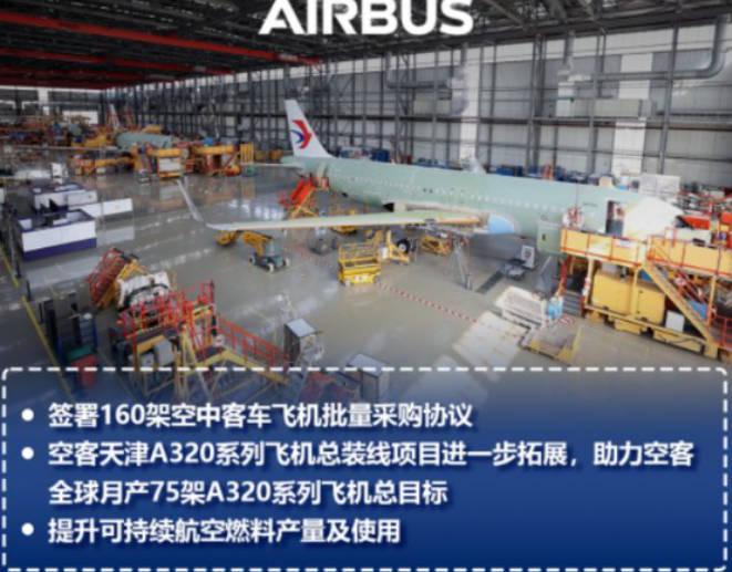 據了解,此次雙方協議總共設計三個方面問題,首先就是中國航空器材集團有限公司與空客公司簽署了160架空客飛機的采購協議,其次是空客公司在天津的a320系列飛機總裝線項目進一步擴展,此項計劃將會助力空客公司在全球達到月產75架a320系列飛機的目標,再者就是中國航空油料公司與空客公司簽署了合作備忘錄,這項計劃將會提升可持續性航空燃料的使用與產量。