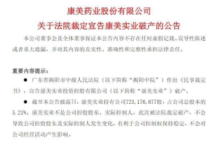 今日ST康美集團(tuán)正式發(fā)布公告,聲稱已宣布破產(chǎn),康美集團(tuán)從廣東省揭陽市中級人民法院已作出民事裁定書,正式宣布康美實業(yè)投資控股有限公司破產(chǎn),在破產(chǎn)公告之中還提到了康美企業(yè)早在2002年9月17號揭陽中院受理普寧市建筑材料檢測中心,對公司股東康美實業(yè)提出破產(chǎn)清算的申請,揭陽中醫(yī)院針對康美實驗所發(fā)布的民事裁定書中明確指出,法院目前認(rèn)為康美實業(yè)不能清償?shù)狡诘膫鶆?wù),而且目前資產(chǎn)嚴(yán)重不足,已清償所有債務(wù),正式宣布康美實業(yè)破產(chǎn)。