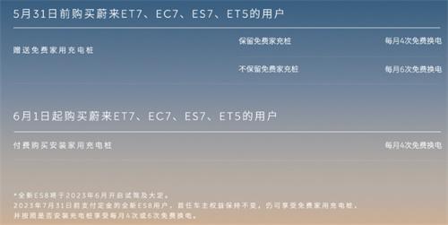 4月10日最新新聞報道,蔚來聲稱自從6月1日開始,所有購買車輛的新用戶不會再提供免費的充電樁,統一按照7500元每根的計算方式付費購買,之前獲得免費充電次數的用戶,統一將充電次數調整為4次,而且各種輔助功能的免費試用也將全面結束,自從7月1日開始升級為正式訂閱版,訂閱價格為380元每月。