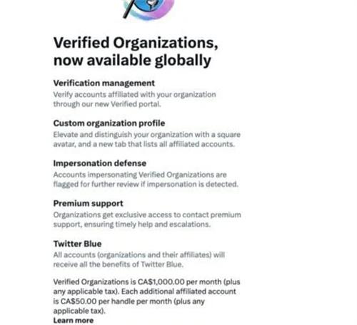 馬斯克在接管Twitter之后清理掉了之前所遺留的認證賬號,4月21號馬斯特正式宣布用戶或者是企業(yè)想要在Twitter平臺投放廣告,就必須去訂閱Twitter Blue服務(wù),每個月需要付費8美元折合人民幣是55元,或者是企業(yè)每月支付1000每原購買erified Organizations 訂閱服務(wù)。