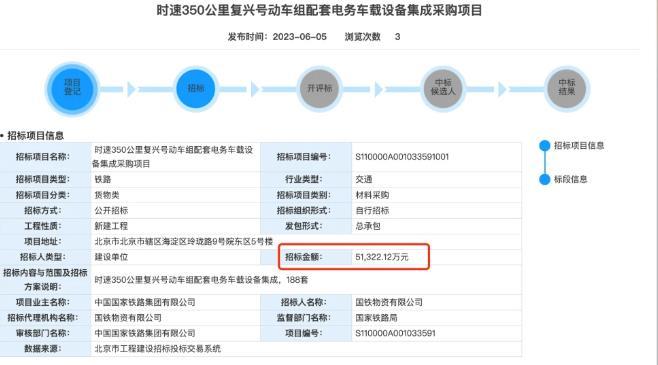 另外,電務車載設備集成采購項目包括188套時速350公里復興號動車組配套電務車載設備集成,招標項目金額約為5.13億元。