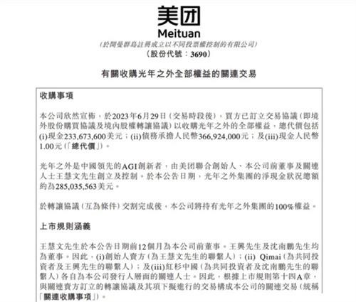 近日,光年之外的創(chuàng)始人王慧文疑似抑郁病住院離崗,給公司帶來(lái)了非常嚴(yán)重的負(fù)面影響,在這個(gè)時(shí)候,美團(tuán)官宣將會(huì)以20.58億元收購(gòu)光年之外,收購(gòu)?fù)瓿芍竺缊F(tuán)集團(tuán)擁有光年之外的100%股權(quán)。此次收購(gòu)的總代價(jià)超過(guò)了20.58億元,光年之外的賬上約有2.8億美元,美團(tuán)官方在公告中表示,通過(guò)收購(gòu)獲得領(lǐng)先的agi人才,可以幫助公司更快的發(fā)展人工智能領(lǐng)域,也能在該領(lǐng)域的競(jìng)爭(zhēng)中獲得更好的發(fā)展趨勢(shì)。