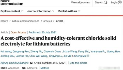 7月3日,媒體從中國科技大學處得知,該校馬聘教授開發了一種新型的固態電解質,這種電解質的綜合性能要比當前最先進的硫化物和氫化物類型的電解質相近,而且所使用的成本僅不到后者的4%,更適合在產業化方面應用,目前該成果已經在6月27日發布在國際著名的學術期刊《自然》中。