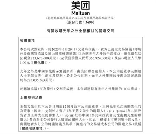 近日,光年之外創(chuàng)始人王慧文因為個人健康問題離崗就醫(yī),正在眾人為光年之外的走向而擔憂的時候,美團在6月29日給出了一份答案,美團表示已經(jīng)完成了光年之外的股權收購,這一次的交易價值總共是2.85億美元加一元現(xiàn)款,因為在收購之前,光年之外的賬面上還躺著2.85億美元的凈現(xiàn)款總額,所以美團的這一次收購也是就是按照凈現(xiàn)款的評價來收購,這一次的消息可以說是掀起了行業(yè)的大震動,畢竟在最近這幾個月,光年之外是一個非常火的大IP。