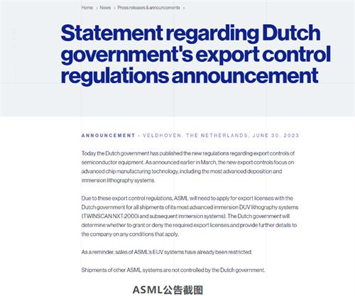 荷蘭光刻機(jī)巨頭Asml在6月30日發(fā)布公告,在這份公告中稱,荷蘭政府在當(dāng)天發(fā)布有關(guān)半導(dǎo)體設(shè)備出口管制的最新規(guī)定,如三月份宣布的信息那樣,最新的出口管制措施重點(diǎn)是在芯片制造領(lǐng)域,其中是包括了最先進(jìn)的沉淀和浸沒(méi)式光刻機(jī)設(shè)備,依據(jù)這些出口管制的法規(guī)來(lái)看,公司如果想要把這些設(shè)備出口到中國(guó)和其他受管制約束的地區(qū),需要向荷蘭政府申請(qǐng)出口許可證。