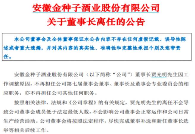 2月22日金種子酒業剛剛發布了公告,稱目前公司的董事長賈光明因為個人的工作調動原因,將會不再擔任公司第7屆董事會董事,董事長以及董事會專業委員會的相應職務,也不再擔任金種子酒業的任何職務,此次金種子酒的董事長突然離任,并沒有說明其他的原因賈光明在上周還剛剛參加了金種子酒的交流活動,根據金種子酒業股份有限公司發布的公告稱,賈光明的離任不會導致公司董事會成員低于法定最低人數,也不會對公司的正常運作和生產經營活動造成影響,公司目前已經按照新的法定程序開始進行新董事長的選舉工作。