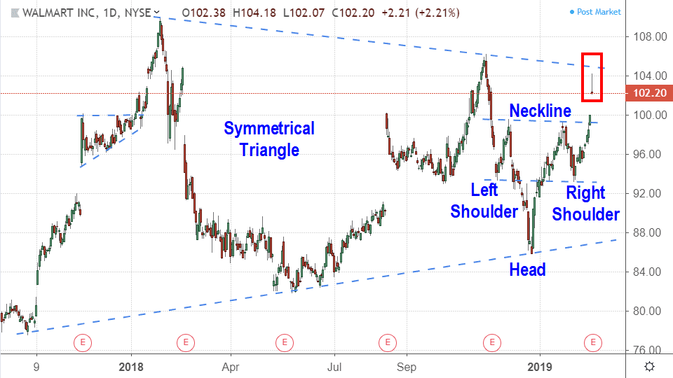 這一尾盤(pán)獲利了結(jié)令沃爾瑪股價(jià)跌破下行阻力位,該阻力位自2018年初以來(lái)一直與該股互動(dòng),當(dāng)時(shí)該股觸及109.98美元的近期高點(diǎn)。該股在2018年11月初再次觸及106.21美元的高點(diǎn),隨后隨著市場(chǎng)其余部分的下跌而暴跌。再加上自2017年10月以來(lái)與股票相互作用的上行支撐位,下行阻力位正在形成一個(gè)潛在的長(zhǎng)期對(duì)稱三角價(jià)格格局。
