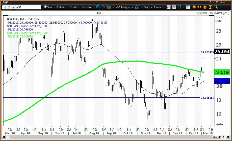 服裝和配飾零售商Abercrombie & Fitch Co.在今晨開盤前公布了好于預期的業(yè)績。該股隨后大幅上漲,達到并超過了我的季度風險水平,目前的核心價位是24.92美元。如果你押注收益,現(xiàn)在就考慮減持!