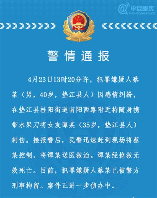 據(jù)重慶市墊江縣公安局通報(bào),4月23日13時(shí)20分許,嫌疑人蔡某因感情糾紛在墊江縣桂陽(yáng)街道南陽(yáng)西路附近持水果刀將其女友譚某刺傷。當(dāng)?shù)孛窬拥綀?bào)警后迅速趕往現(xiàn)場(chǎng)并控制住了蔡某,同時(shí)將譚某送往醫(yī)院搶救。然而,譚某在醫(yī)院搶救無(wú)效后不幸去世。目前,犯罪嫌疑人蔡某已被警方刑事拘留,案件正在進(jìn)一步調(diào)查中。