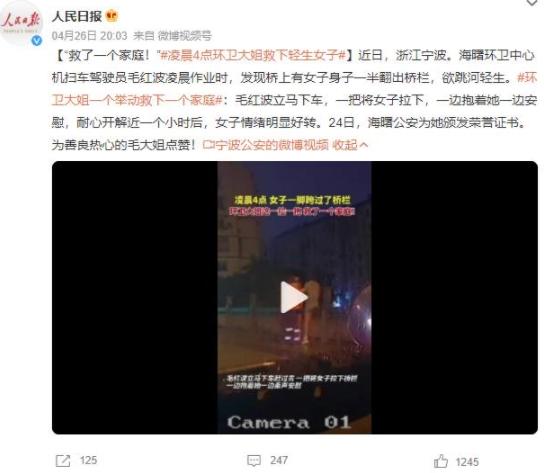 近日,寧波環衛大姐毛紅波英勇救人,挽救一家之命。凌晨作業時,毛紅波發現一名女子欲跳河輕生,她毫不猶豫地沖上前去,將女子從橋上拉了下來,并安慰開導她近一個小時。24日,她因救人行為獲得海曙公安頒發的榮譽證書。這個事件充滿溫情,值得我們點贊環衛大姐的善良熱心。