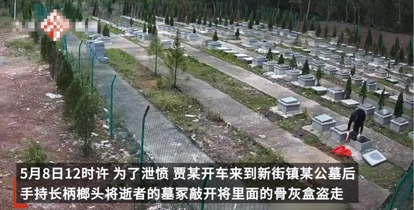 據了解,事發當天中午約12時,賈某駕車來到新街鎮的某公墓。他手持一把長柄榔頭,敲開了逝者的墓冢,并盜走了骨灰盒,以此來泄憤。事后,賈某將盜得的骨灰盒扔進了附近的河道。