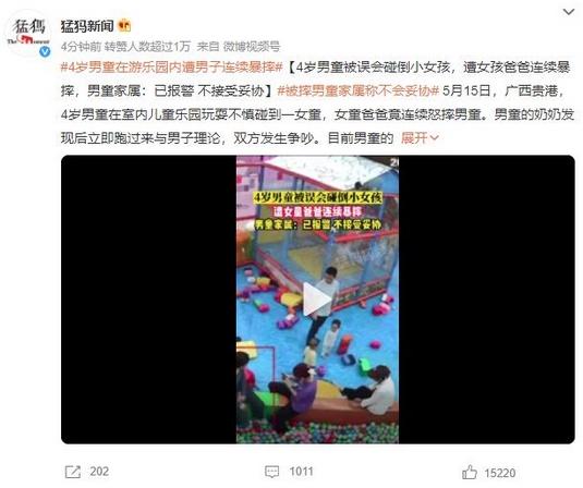 據報道,5月15日在廣西貴港的一家室內兒童樂園發生了一起令人震驚的事件。一名4歲男童在玩耍時不慎碰到一名女童,隨后女童的父親竟然連續怒摔這名男童。男童的奶奶目睹了整個過程后立即上前與男子理論,并引發了雙方的爭吵。