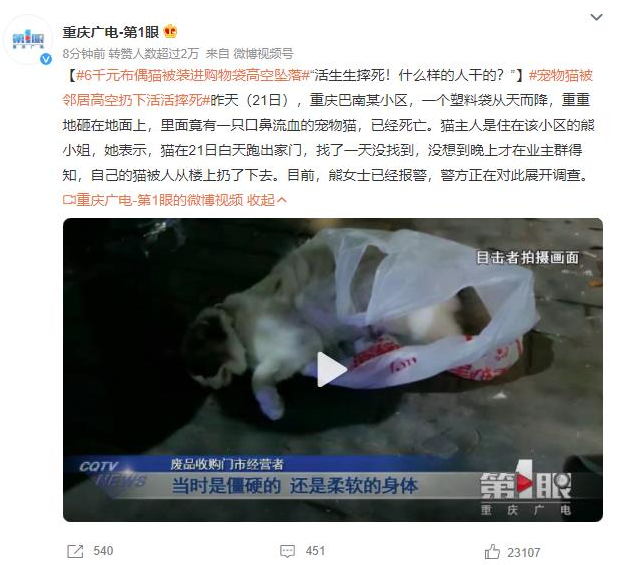 2023年5月21日,重慶巴南某小區發生了一起令人震驚和憤怒的事件。一個塑料袋從天而降,里面裝著一只口鼻流血的寵物貓,慘死在地面上。貓主人熊小姐住在該小區,她表示,貓在當天白天跑出家門,一整天都在找尋它的下落,卻在晚上才從業主群得知,自己的貓竟然被人從樓上扔下,導致慘死。目前,熊小姐已經報警,警方正展開調查。