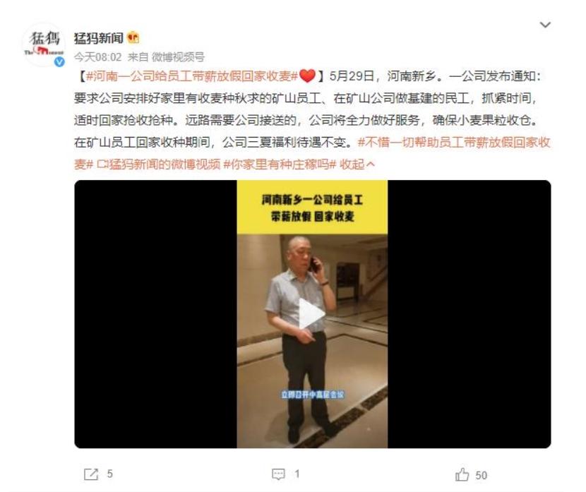 近日,河南新鄉一家公司發布了一份通知,要求公司安排有收麥種秋求的礦山員工和在礦山公司從事基建工作的民工,盡快回家參與小麥的搶收搶種工作。對于需要遠程回家的員工,公司表示將全力提供接送服務,確保小麥果粒順利入倉。在員工返鄉期間,公司還承諾三夏福利待遇不變。