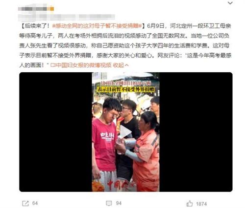 6月9日,河北定州市發(fā)生了一段令人動(dòng)容的場(chǎng)景。一位環(huán)衛(wèi)工母親在高考考場(chǎng)外等待她的兒子,當(dāng)他們相擁一起流淚的視頻在網(wǎng)絡(luò)上廣為流傳,感動(dòng)了全國(guó)無數(shù)網(wǎng)友。而在當(dāng)?shù)兀@個(gè)故事也引起了一位公司負(fù)責(zé)人的關(guān)注。