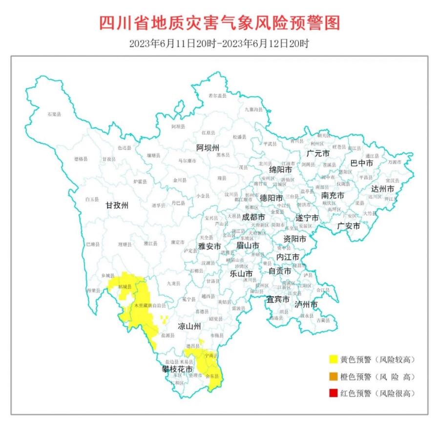 根據四川省自然資源廳的消息,四川省地質災害指揮部辦公室發布了全省地質災害氣象風險預警。本次預警為3級黃色預警,預警時間為6月11日20時至6月12日20時。涉及到甘孜州理塘縣、鄉城縣、稻城縣,涼山州會理市、木里縣、鹽源縣、德昌縣、會東縣、寧南縣、普格縣等2州10個縣(市)。