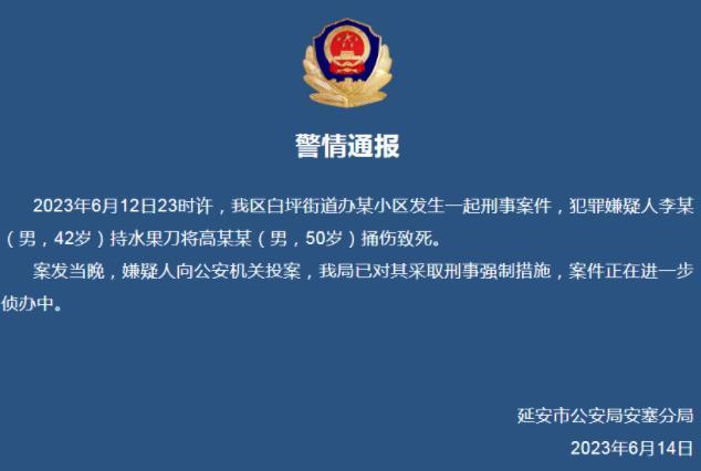 2023年6月12日23時(shí)許,我區(qū)白坪街道辦發(fā)生一起嚴(yán)重刑事案件。案件中,犯罪嫌疑人李某(男,42歲)持水果刀將高某某(男,50歲)捅傷致死。