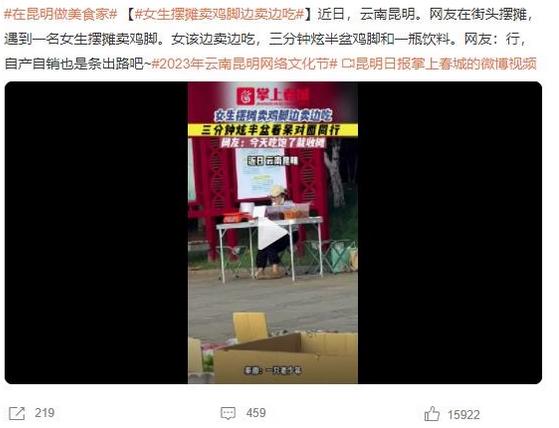 據網友們描述,他們在昆明街頭遇到了這位女生擺攤賣雞腳。女生不僅賣雞腳,還表現出一種炫耀的風格,邊賣邊吃,展示出大量的雞腳和一瓶飲料。這種獨特的創業方式吸引了眾多路人的目光和好奇。