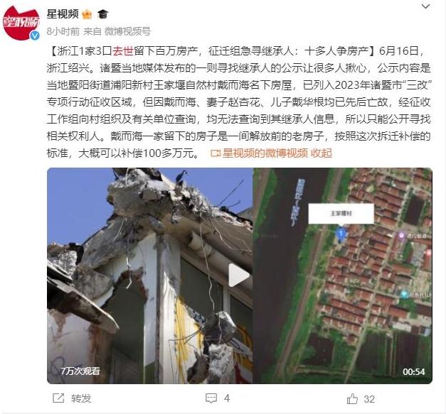 6月16日,浙江紹興出現(xiàn)了一則令人擔憂的公告。諸暨當?shù)孛襟w發(fā)布了一則公示,尋找繼承人的消息引起了廣泛關(guān)注。公告內(nèi)容指出,浦陽新村王家堰自然村的房屋已被列入2023年諸暨市“三改”專項行動征收區(qū)域。然而,由于房屋的所有者戴而海、妻子趙杏花以及兒子戴華根相繼去世,征收工作組向村組織和相關(guān)單位查詢均無法獲得繼承人的信息,因此只能公開尋找相關(guān)權(quán)利人。戴而海一家留下的房子是一座解放前的老房子,根據(jù)拆遷補償?shù)臉藴?,預計補償金額將超過100萬元。