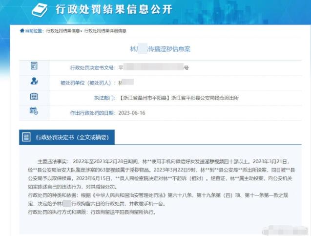 近日,在浙江政務(wù)服務(wù)網(wǎng)上出現(xiàn)了一起罕見的行政處罰案例。一名來自平陽的男子林某某因“傳播淫穢信息”而受到派出所的行政拘留處罰,為期六天。