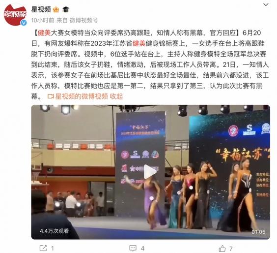 據網友爆料,這一事件發生在2023年江蘇省健美健身錦標賽上。在比賽結束的頒獎環節中,主持人宣布該場比賽的全場冠軍總決賽已經結束。突然間,一名女選手情緒激動地將高跟鞋脫下并扔向評委席,隨后被現場工作人員帶離。