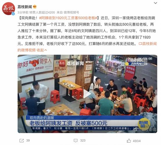 近日,一則關于深圳一家燒烤店洗碗阿姨給老板塞500元的新聞引發了廣泛關注。這位洗碗阿姨名叫文阿姨,已經在深圳生活了12年,今年5月她急需找工作,幸運的是,燒烤店老板主動給了她洗碗的工作機會,并結算了她第一個月的工資,共計1920元。