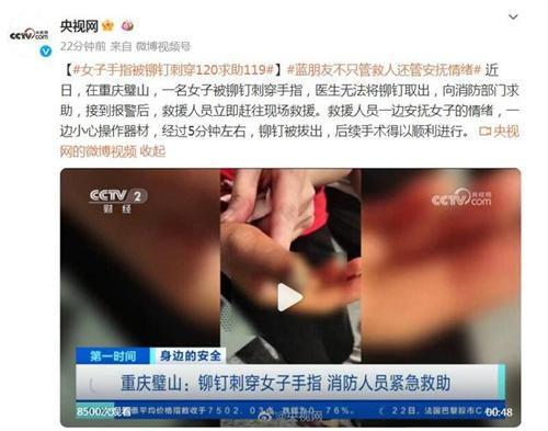 近日,在重慶璧山發生了一起驚險事件,一名女子的手指被鉚釘刺穿,無法自行取出。情況緊急,醫生決定向消防部門求助。得知報警后,消防救援人員立即出動,趕往現場進行救援。他們在安撫女子情緒的同時,小心翼翼地操作救援器材。經過大約5分鐘的努力,成功將鉚釘取出,為后續手術的順利進行創造了條件。
