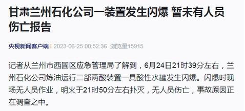 據(jù)蘭州市西固區(qū)應(yīng)急管理局透露,發(fā)生在6月24日21時(shí)39分左右的一起事故中,蘭州石化公司煉油運(yùn)行二部的兩酸裝置中的一具酸性水罐發(fā)生了閃爆事件。幸好事發(fā)時(shí)現(xiàn)場(chǎng)沒有人員作業(yè),明火在21時(shí)50分左右被撲滅,所幸沒有人員傷亡。目前,事故的具體原因正在進(jìn)行調(diào)查。