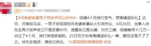最近,河南駐馬店發生了一起令人痛心的家暴事件,一名男子徐先生發布了一段視頻,揭露了他婚姻中遭受的家暴和威脅。6月26日,徐先生再次發聲,否認自己有任何惡意炒作的目的,并透露了一些婚姻的細節。他表示自己是首次結婚,而對方已經是第三次婚姻,婚禮費用高達十幾萬,而這段婚姻僅持續了4個月,期間他不僅遭受了身體上的傷害和言語上的羞辱,還受到了威脅。
