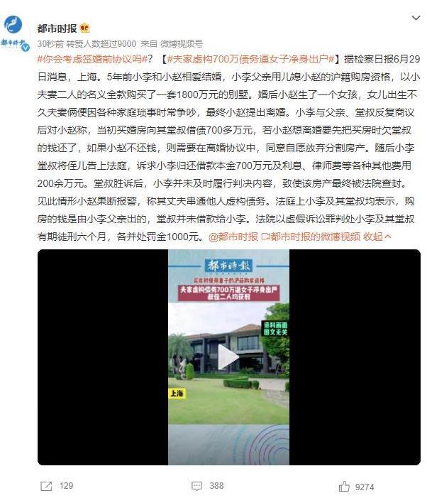根據檢察日報6月29日的報道,發生了一起涉及離婚爭產的虛假訴訟案件。5年前,小李和小趙相愛并結婚,小李的父親利用小趙的滬籍購房資格,以小夫妻二人的名義全款購買了一套價值1800萬元的別墅。然而,婚后,夫妻倆因家庭瑣事經常爭吵,最終小趙提出離婚。小李及其父親、堂叔商議后,對小趙提出要求,稱當初買婚房時向堂叔借債700多萬元,若小趙想離婚,就必須先償還這筆債務。如果小趙不還錢,就需要在離婚協議中自愿放棄對房產的分割權。隨后,小李的堂叔將侄兒告上法庭,要求小李歸還借款本金700萬元及利息、律師費等其他費用共計200余萬元。堂叔最終勝訴,然而,小李未及時履行判決內容,導致該房產被法院查封。在這種情況下,小趙果斷報警,指稱其丈夫串通他人虛構債務。法庭審理中,小李及其堂叔均表示購房款項是由小李的父親提供的,并未向堂叔借款。法院最終以虛假訴訟罪判處小李及其堂叔有期徒刑六個月,并處罰金1000元。這個案件引起了廣泛關注,凸顯了虛假訴訟的危害性及其對當事人的法律責任。