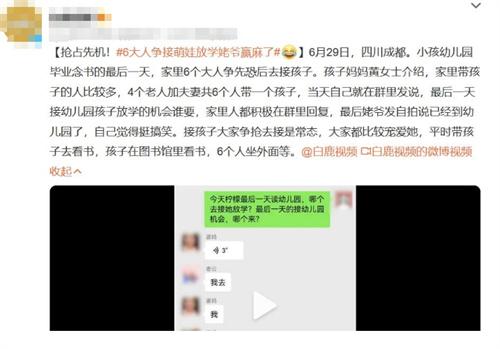 在四川成都的一個幼兒園,6月29日成為了一個熱鬧而歡樂的日子。這是小孩幼兒園畢業的最后一天,家里的6個大人紛紛前往接孩子放學,爭先恐后地想成為幸運的接送人。孩子的媽媽黃女士告訴我們,家里帶孩子的人比較多,包括4位老人和夫妻兩人,共計6個人照顧一個孩子。當天,黃女士在家庭群里發布了一則消息,詢問家里人誰想要接幼兒園孩子放學,大家都積極回復,希望能成為這個特殊時刻的接送人。最終,姥爺在群里發了一張自拍照,并表示已經到達幼兒園,這讓大家覺得十分有趣和搞笑。