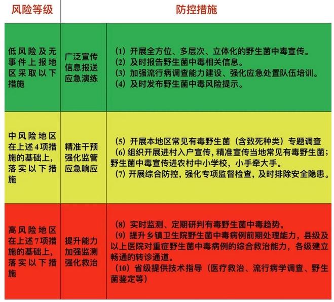 根據(jù)不同風(fēng)險等級地區(qū)的特點(diǎn)和需求,針對性制定了2023年全省有毒野生菌中毒風(fēng)險防控措施。這些措施包括宣傳發(fā)動、信息報送、加強(qiáng)監(jiān)測、精準(zhǔn)干預(yù)、強(qiáng)化監(jiān)管、應(yīng)急響應(yīng)和強(qiáng)化救治等方面的內(nèi)容。對于高風(fēng)險地區(qū),將加強(qiáng)宣傳教育,提高公眾對有毒野生菌的認(rèn)知和防范意識;加強(qiáng)監(jiān)測工作,及時掌握風(fēng)險情況;建立精準(zhǔn)干預(yù)機(jī)制,對中毒事件進(jìn)行快速響應(yīng)和處置。對于中風(fēng)險地區(qū),將加強(qiáng)監(jiān)管力度,加強(qiáng)對有毒野生菌的采摘、銷售和消費(fèi)環(huán)節(jié)的監(jiān)管,確保食品安全。對于低風(fēng)險地區(qū),將加強(qiáng)風(fēng)險宣傳和教育,提醒公眾注意采摘和食用的安全性,加強(qiáng)監(jiān)測預(yù)警工作,確保食品安全穩(wěn)定。