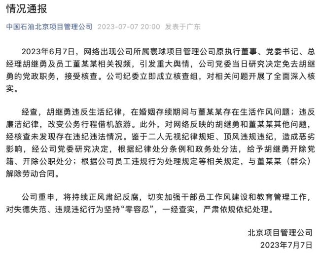 近日,中國石油北京項目管理公司發(fā)布了一份關(guān)于胡繼勇等人違紀(jì)問題的處理決定通報。根據(jù)通報內(nèi)容,胡繼勇原為寰球項目管理公司的執(zhí)行董事、黨委書記、總經(jīng)理。然而,他在2023年6月7日所涉及的相關(guān)視頻在網(wǎng)絡(luò)上廣泛傳播,引發(fā)了重大的輿情影響。公司黨委對此進(jìn)行了研究,并決定免去胡繼勇的黨政職務(wù),同時進(jìn)行核查。