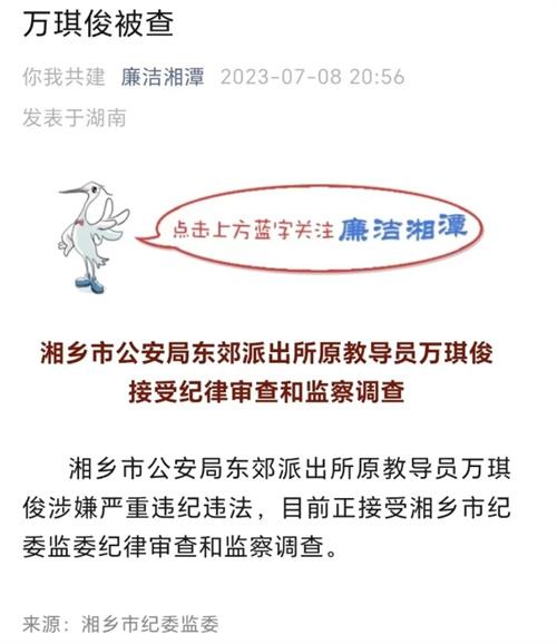 7月8日晚,湖南湘潭市紀委通過官方微信發布消息,宣布湘鄉市公安局東郊派出所原教導員萬琪俊涉嫌嚴重違紀違法,目前正接受紀委監委紀律審查和監察調查。此前,萬琪俊因被舉報借辦案索賄50多萬元引起廣泛關注。湘鄉市紀委已組成聯合調查組,展開核查,并免去萬琪俊的教導員職務。
