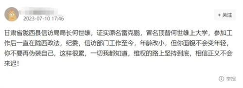 近年來(lái),何世雄了解到隴西縣信訪(fǎng)局局長(zhǎng)何世雄與他的原名雷克鵬相同,引發(fā)了他對(duì)自己身份信息的懷疑。通過(guò)調(diào)查和了解,他發(fā)現(xiàn)當(dāng)年在隴西一中同班的確實(shí)有一個(gè)名叫雷克鵬的人,但他們并非同一個(gè)班級(jí)的學(xué)生。何世雄向多個(gè)部門(mén)舉報(bào)此事,但并未公開(kāi)詳細(xì)的調(diào)查過(guò)程,只得到一個(gè)結(jié)果。