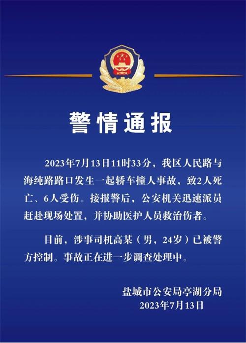 7月13日上午,江蘇鹽城市發生了一起令人震驚的車禍事故。據鹽城市公安局亭湖分局官方微信通報,事故發生在亭湖區人民路與海純路路口,一輛轎車撞人導致2人死亡、6人受傷。警方接報后立即派員趕赴現場處置,并協助醫護人員救治傷者。