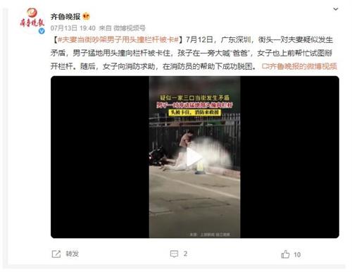 7月12日,廣東深圳市一對(duì)夫妻在街頭發(fā)生矛盾,男子情緒激動(dòng)之下猛地用頭撞向欄桿,結(jié)果卡住無(wú)法脫身。孩子目睹父親困境,大聲呼喊著"爸爸",而妻子也緊急上前尋求幫助并向消防隊(duì)求援。經(jīng)過(guò)消防員的協(xié)助,男子最終成功脫困。