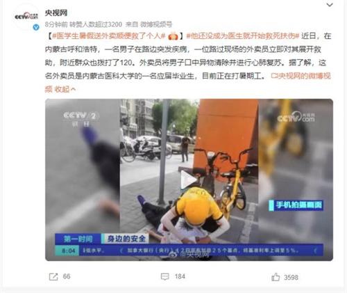 這位外賣(mài)員不僅迅速清除了男子口中的異物,還進(jìn)行了心肺復(fù)蘇術(shù),為他爭(zhēng)取了寶貴的時(shí)間。據(jù)了解,這位外賣(mài)員是一名內(nèi)蒙古醫(yī)科大學(xué)的應(yīng)屆畢業(yè)生,目前正在打暑期工。他的醫(yī)學(xué)知識(shí)和應(yīng)急處理能力發(fā)揮了重要作用,挽救了這名男子的生命。