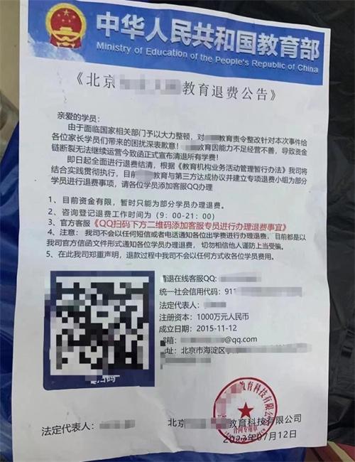 近日,一些學生家長收到了一份“某教育培訓機構退費單公告”,聲稱該機構因資金鏈斷裂,將為部分學員辦理退費。公告中附有QQ號和二維碼,引誘一些家長掃碼并添加客服QQ進行退費操作,但最終他們卻成為了詐騙的受害者。