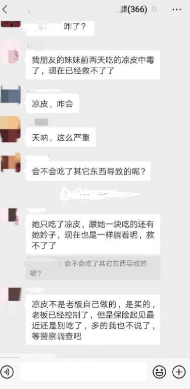 據(jù)網(wǎng)傳消息,事發(fā)時(shí),一名約20歲的女孩與家人在永城市百花街吃了一碗涼皮后中毒,目前該女生正在醫(yī)院ICU住院,而她同行的舅媽已經(jīng)不幸離世。為防范風(fēng)險(xiǎn),永城市全市涼皮店已被要求停止銷售。消息最早出現(xiàn)于7月10日,一份微信業(yè)主群的聊天截圖顯示,一位業(yè)主稱其朋友的妹妹吃涼皮中毒已無(wú)法挽救,而舅媽同樣也無(wú)法幸免。關(guān)于中毒原因,網(wǎng)傳消息存在兩種說(shuō)法,一種稱涼皮中添加了過(guò)量的硼砂,另一種稱涼皮發(fā)生了變質(zhì),滋生了米酵菌酸,從而引發(fā)中毒。