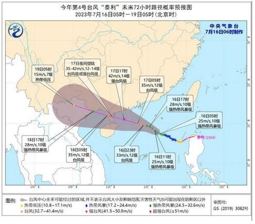 預計,臺風泰利將以每小時15公里左右的速度向西北方向移動,強度逐漸增強。預計17日夜間,臺風將在廣東臺山到海南文昌一帶沿海登陸,登陸時臺風級或強臺風級,風力在35-42米/秒之間,級數為12-14級。之后,臺風將進入北部灣,并趨向越南北部沿海和廣西沿海。